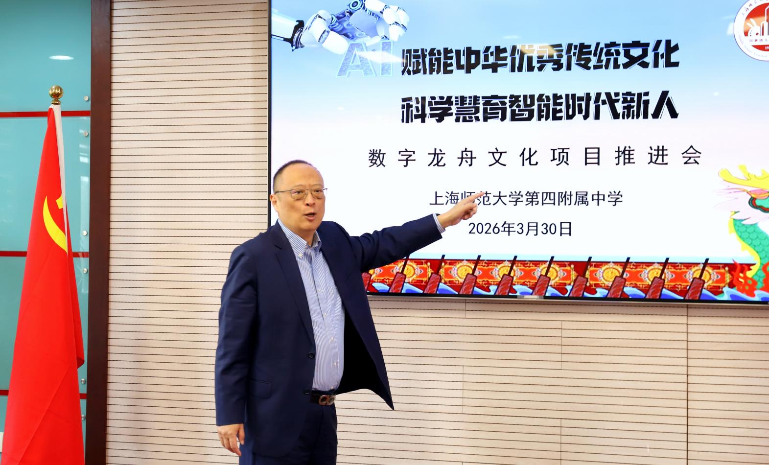为深入贯彻立德树人根本任务,传承弘扬中华优秀传统文化,积极响应国家创新驱动发展战略,全面落实“人工智能+”行动部署,主动对接上海及长三角地区高质量发展需求,3月30日,上海师范大学第四附属中学在第一会议室隆重举行龙舟科技文化项目推进会。校党总支书记李宇靖,党总支副书记、校长朱银辉,副校长龚永娟等学校领导出席会议,学校特邀上海师范大学基础教育集团督学、中国STEM教育联盟创始发起人、本校特聘科学教育总顾问邹晓东教授一行莅临现场指导工作。