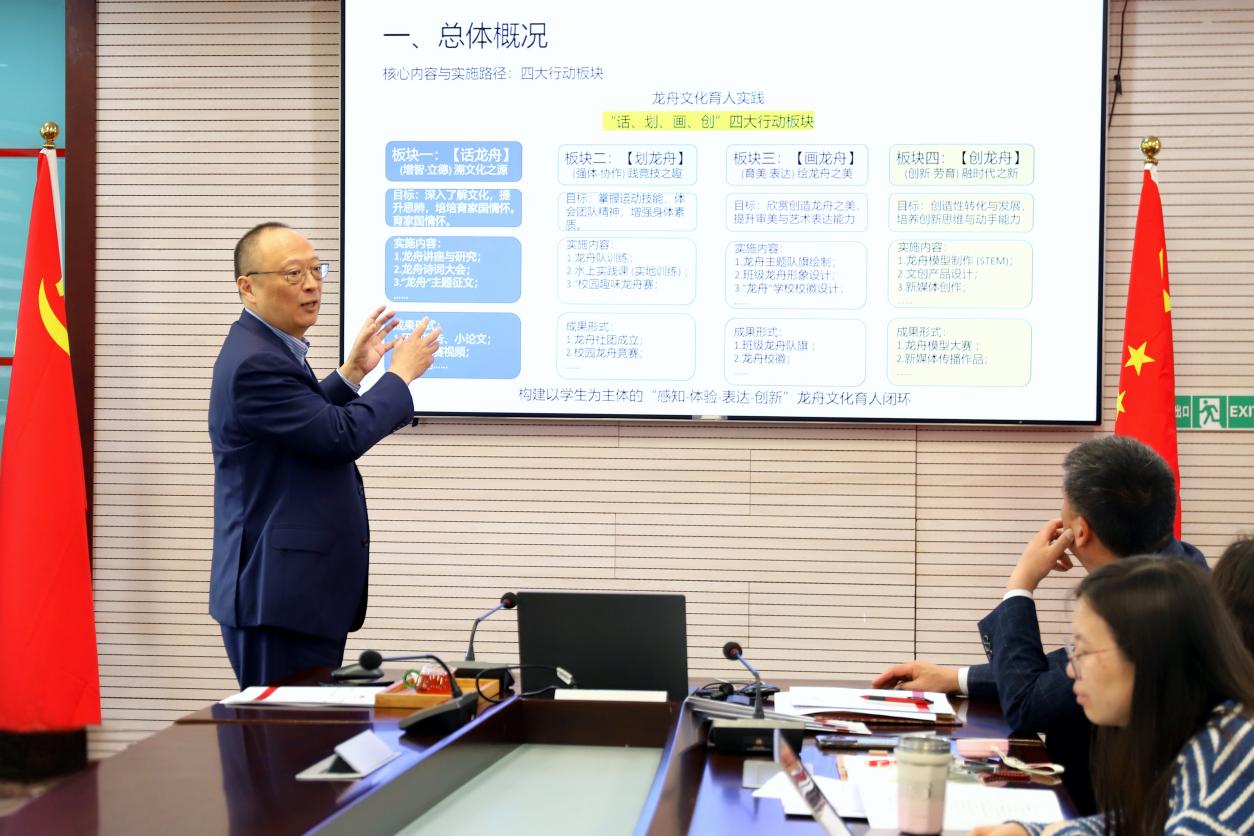 会议伊始,教师发展中心干事赵周平向邹晓东教授一行详细介绍了学校龙舟科技文化项目。她围绕项目建设背景、总体目标、实施概况展开全面阐述,重点汇报了项目现阶段推进成果、特色育人路径以及未来长远发展规划。学校立足育人根本,以社团活动、研究性课题、赛事实践等多元化载体为依托,将人工智能技术与龙舟文化深度融合,深入挖掘龙舟文化承载的精神品格与科学智慧,积极探索中华优秀传统文化在智能时代的创新表达,全力构建“科技+文化”双向赋能的育人新路径。