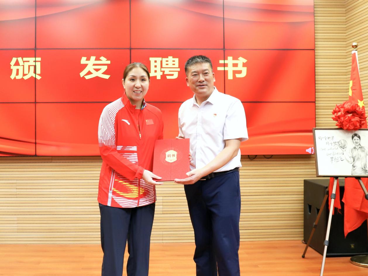 活动在庄严的国歌声中拉开帷幕。首先是由校党总支副书记、校长朱银辉为劳模嘉宾章旭飞颁发生涯导师聘书,希望她能将永不服输的体育精神扎根于校园,持续为青年学子的成长注入榜样力量。
