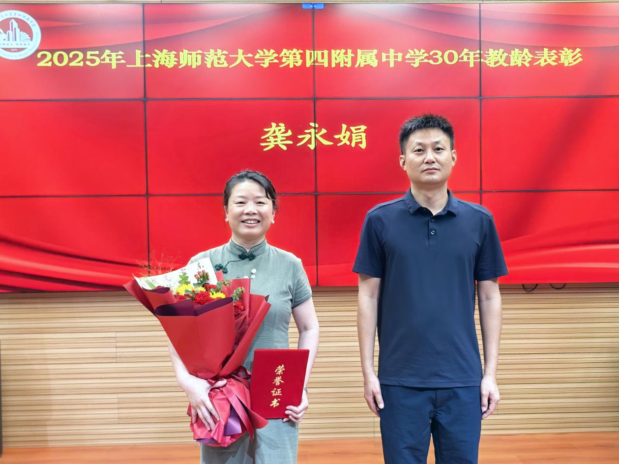 表彰环节中,第一批表彰的是2023-2024年度上海师范大学三八红旗手黄歆晨老师,以及2025年度上海师范大学优秀教师杨志杰老师,由党总支副书记、校长朱银辉颁发荣誉证书。第二批表彰的是从教30年的龚永娟老师,党总支书记李宇靖为其颁发荣誉证书并献上鲜花,全场以热烈掌声向龚老师表达敬意。