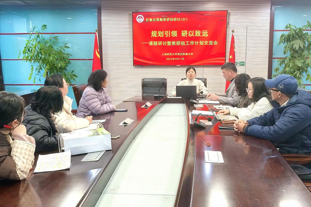 春启新程,研途芬芳。2026年3月17日,上海师范大学第四附属中学区重点课题研讨暨教研组工作计划交流会在第一会议室举行。校党总支副书记、校长朱银辉,副校长龚永娟以及教研组长等相关人员齐聚一堂,共研共商新学期教研工作。会议由教师发展中心葛明萌主持。
